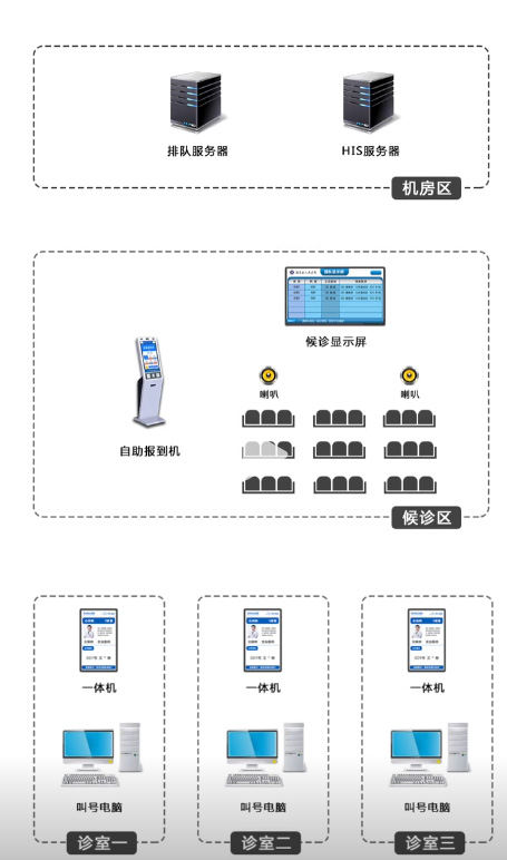 排隊叫號系統(tǒng)圖,機房區(qū)由排隊服務器和叫號服務器組成。候診區(qū)由自助報道一體機,播放喇叭候診顯示屏組成。診室區(qū)由排隊叫號顯示一體機和呼叫電腦組成,同時服務器顯示屏叫號一體機都是通過tcp聯(lián)網。