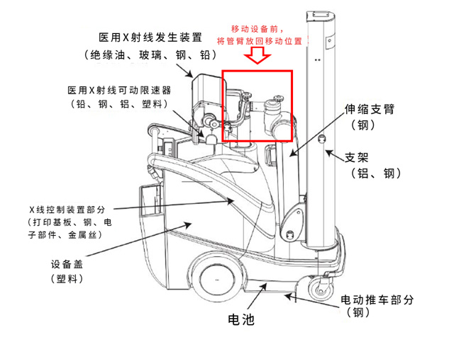 二、移動姿勢,移動DR的結(jié)構(gòu)跟配件有醫(yī)用X射線發(fā)生裝置(絕緣油、玻璃、鋼、鉛),醫(yī)用X射線可動限速器(鉛、鋼、鋁、塑料),X線控制裝置部分(打印基板、鋼、電子部件、金屬絲)。伸縮支臂(鋼),支架(鋁、鋼)。移動設(shè)備之前,需要將管臂放回移動位置。