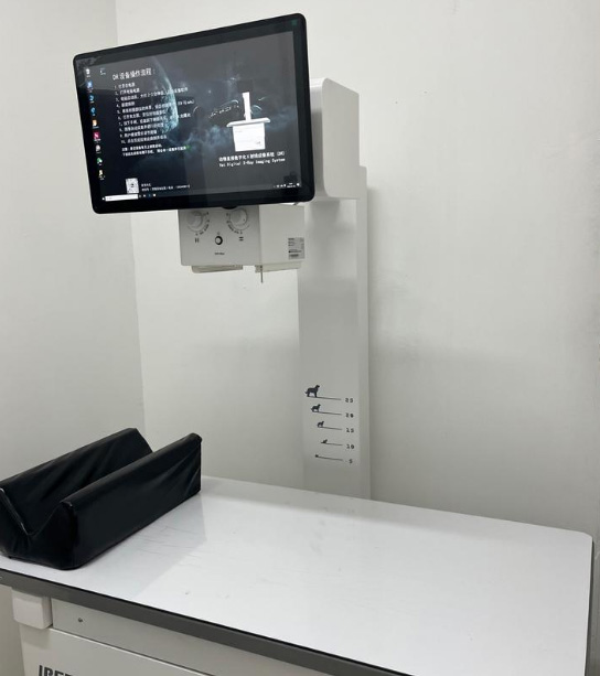 這就是寵物專用的寵物DR影像系統(tǒng),檢查設備非常重要??焖倥袛嗖∏镈R系統(tǒng)由于它成像快的優(yōu)點,現(xiàn)在已經(jīng)在寵物醫(yī)院廣泛的使用的儀器設備。都是比較有實力的寵物醫(yī)院??梢栽趧游飫討B(tài)情況下進行DR攝片檢查。DR的作用在臨床中拍片子,可以看有沒骨折、有沒有膀胱石,有幾個胎兒等等,DR的手術床可以活動的方便我們中間去選位置,可以跟這個大小調(diào)整位置。鉛衣是做拍攝防護的,選擇拍攝部位,腿部、胸部、前肢等。不同部位的值也是不一樣的。千伏毫秒都不一樣。