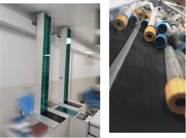 采血試管自動化傳輸平穩(wěn)準確的傳到各個位置,前段的試管跟貼標機系統(tǒng)和后端分揀機的系統(tǒng)實現(xiàn)對接。